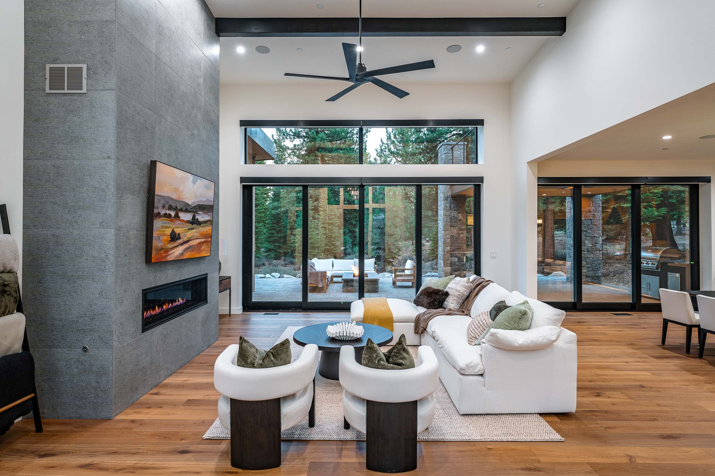 Spanning 4,313 square feet, the residence includes six bedrooms and five bathrooms, with dual primary suites and a versatile office or third bedroom on the main level—perfect for multi-generational living or hosting guests. Large windows and multi-slide doors fill the interior with natural light, opening to a 1,000-square-foot terrace featuring a fire pit and heated dining area for year-round enjoyment.